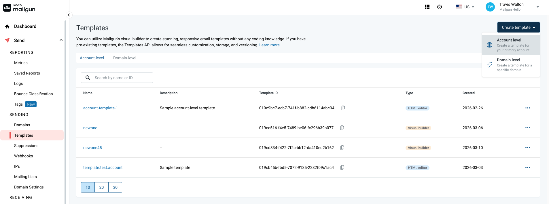 This is the most flexible option. Account-level templates are created centrally on your Mailgun account and can be used to send emails from any of your sending domains. They can also be used on behalf of your subaccounts, making them ideal for managing a consistent brand identity across your entire account structure.