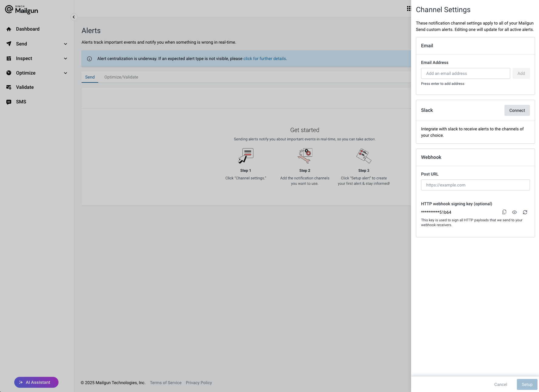To configure Mailgun send alerts, navigate to the Alerts option in Mailgun and start configuration by setting up your notification channels.
