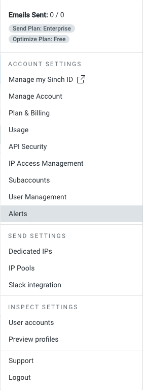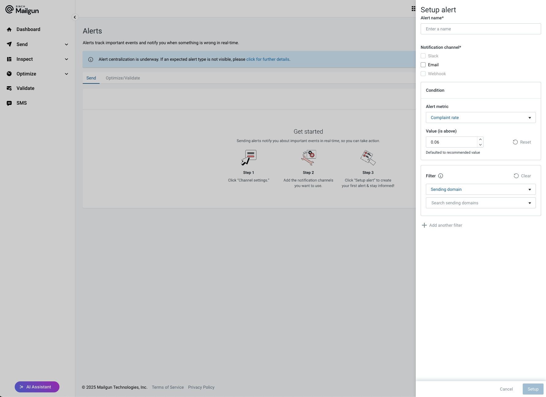 Through the centralized Alerts UI you are able to configure alerts based on core sending metrics as well as configure notifications settings for the Mailgun Optimize and Mailgun Validate products.